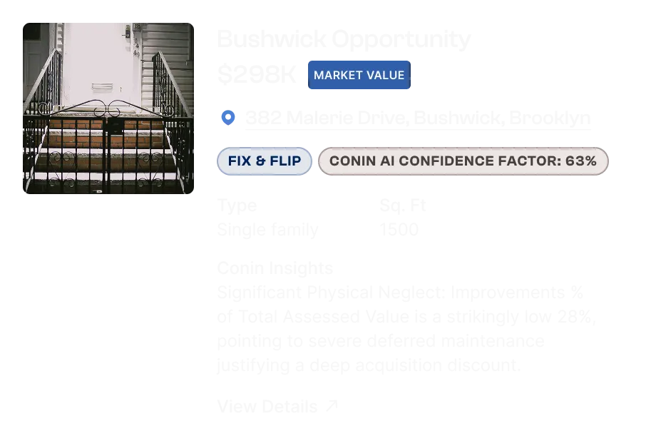 Conin uses strategic benchmarks and AI to instantly analyze property data points, surfacing only the most qualified opportunities for non-institutional residential real-estate investors. Every search is tailored to how you actually invest and execute.