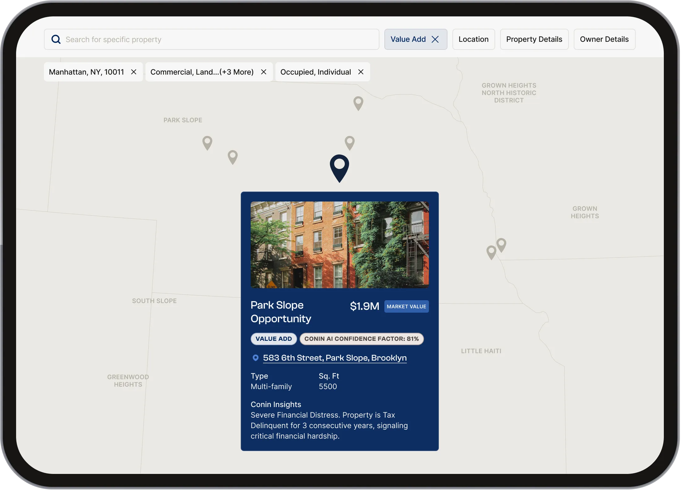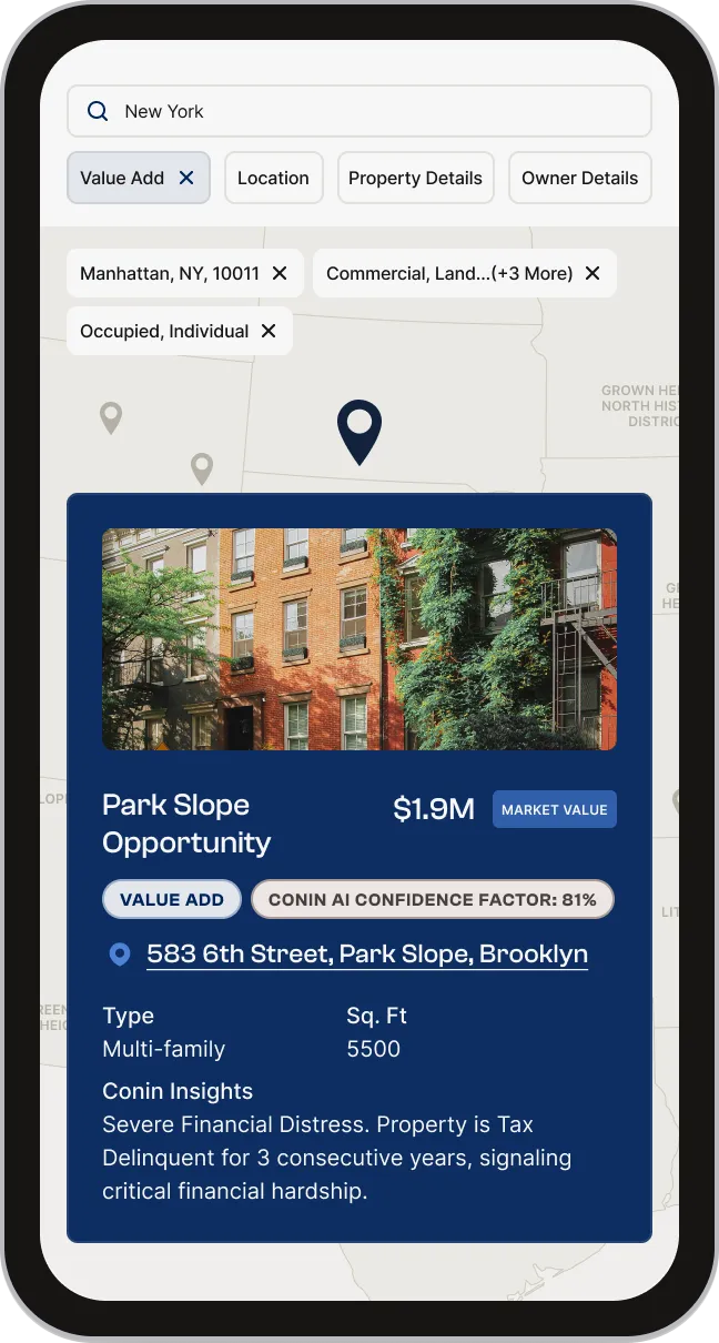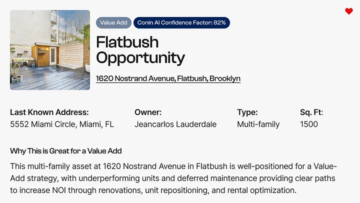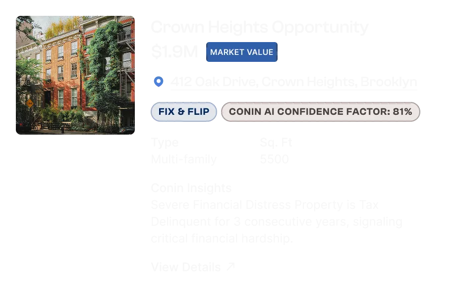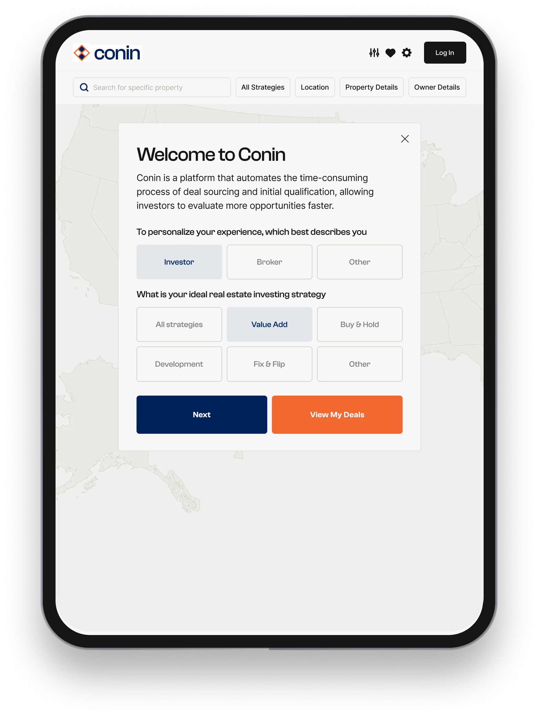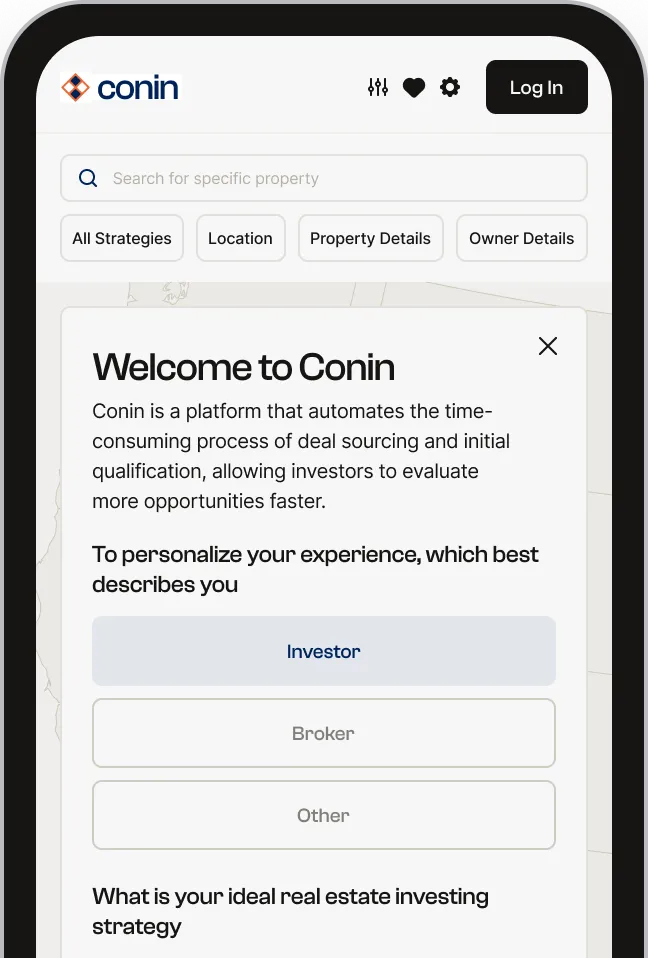Conin uses key data points to surface high-upside residential deals for real estate investors in minutes. Using smarter AI intelligence, it’s faster, more efficient, and all curated to match your needs and investment strategy. With Conin, you search, close, and get down to business with speed and confidence.