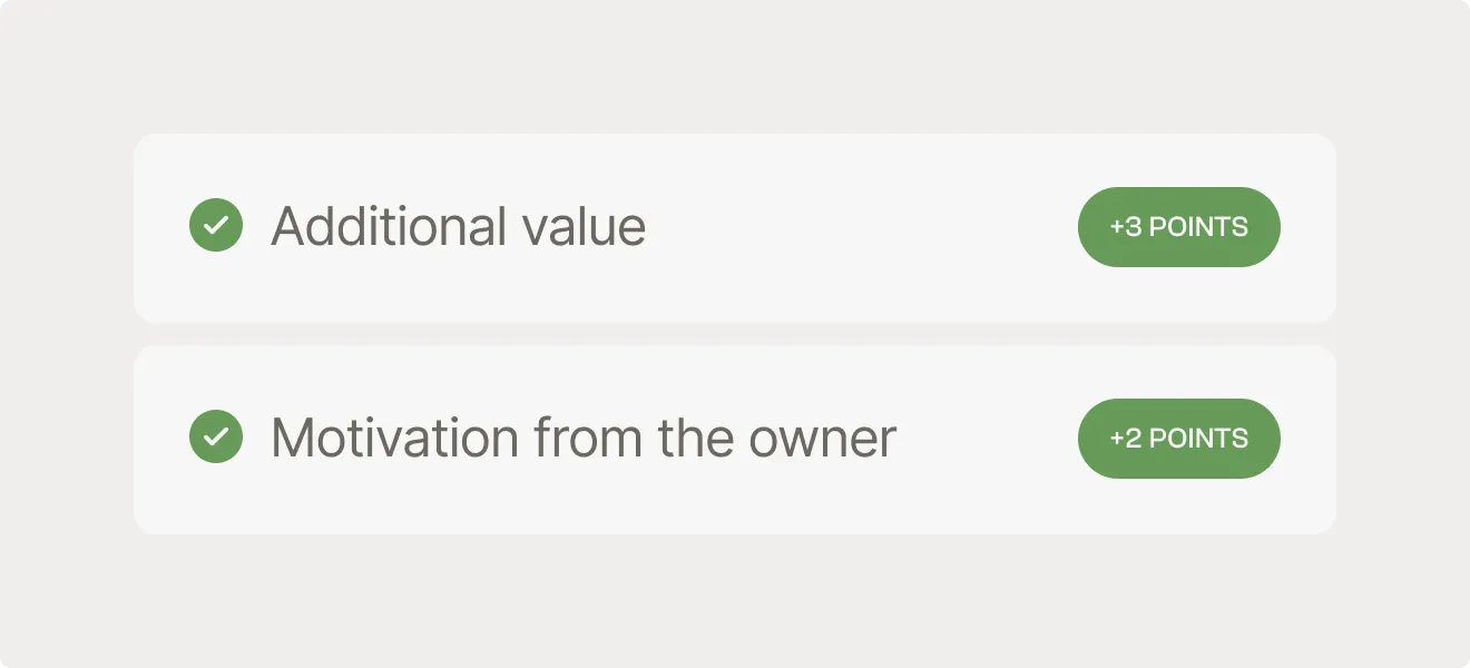 Is there added value? We add 3 more points. Is there motivation from the owner? We add 2 more points.